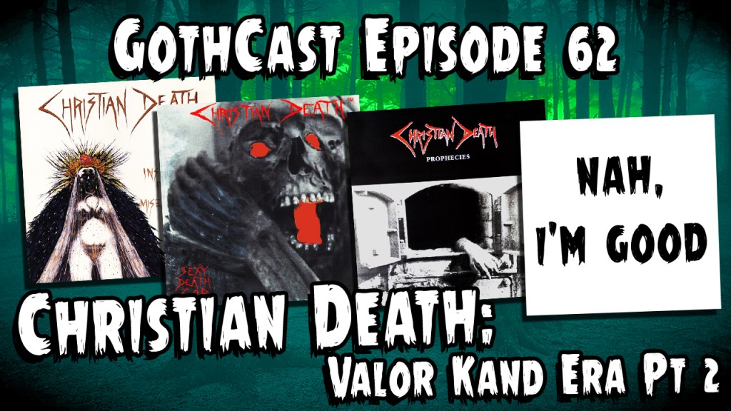 This reunion episode brings back Robbie Gore as the original GothCast duo break down some lesser talked about albums from the Valor Kand era of Christian Death. It’s one of the more interesting eras of the group as two competing versions of the band were releasing material sometimes within the same year. They cover the albums Insanus, Ultio, Proditio, Misericordiaque (1990), Sexy Death God (1994), Prophecies (1996), and well…one more from 1998. This one gets a little strange, but that’s nothing new to this podcast.